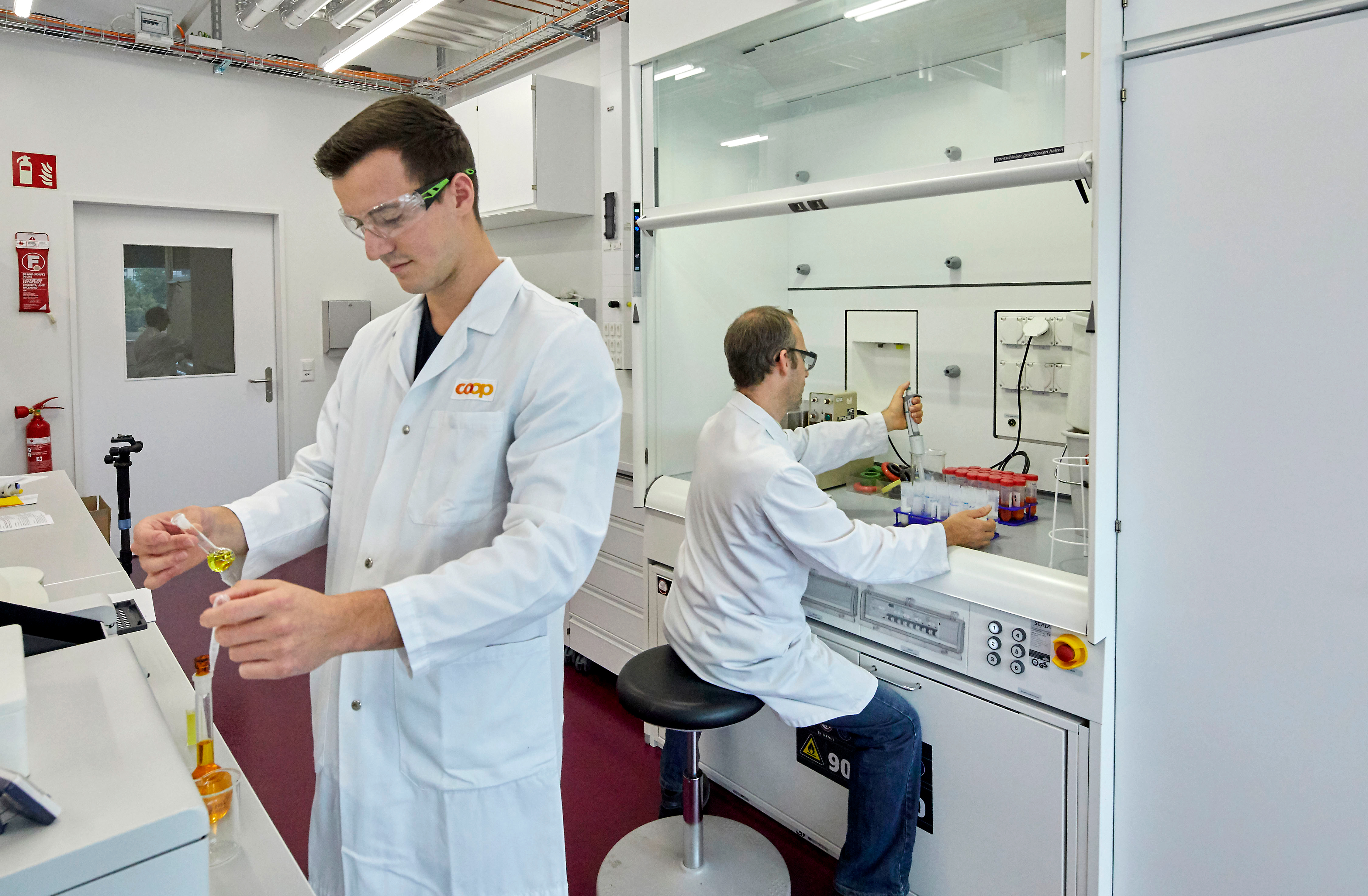 Un grand nombre de bouteilles de vin sont alignées sur le plan de travail d’un autre laboratoire. Elles proviennent de la propre cave de Coop, qui est également intégrée dans le nouveau complexe de bâtiments à Pratteln et cultive, transforme et met en bouteille les breuvages les plus variés provenant du monde entier. Les vins sélectionnés sont contrôlés par échantillonnage à la recherche de pesticides. Les vins bio sont contrôlés de manière systématique.