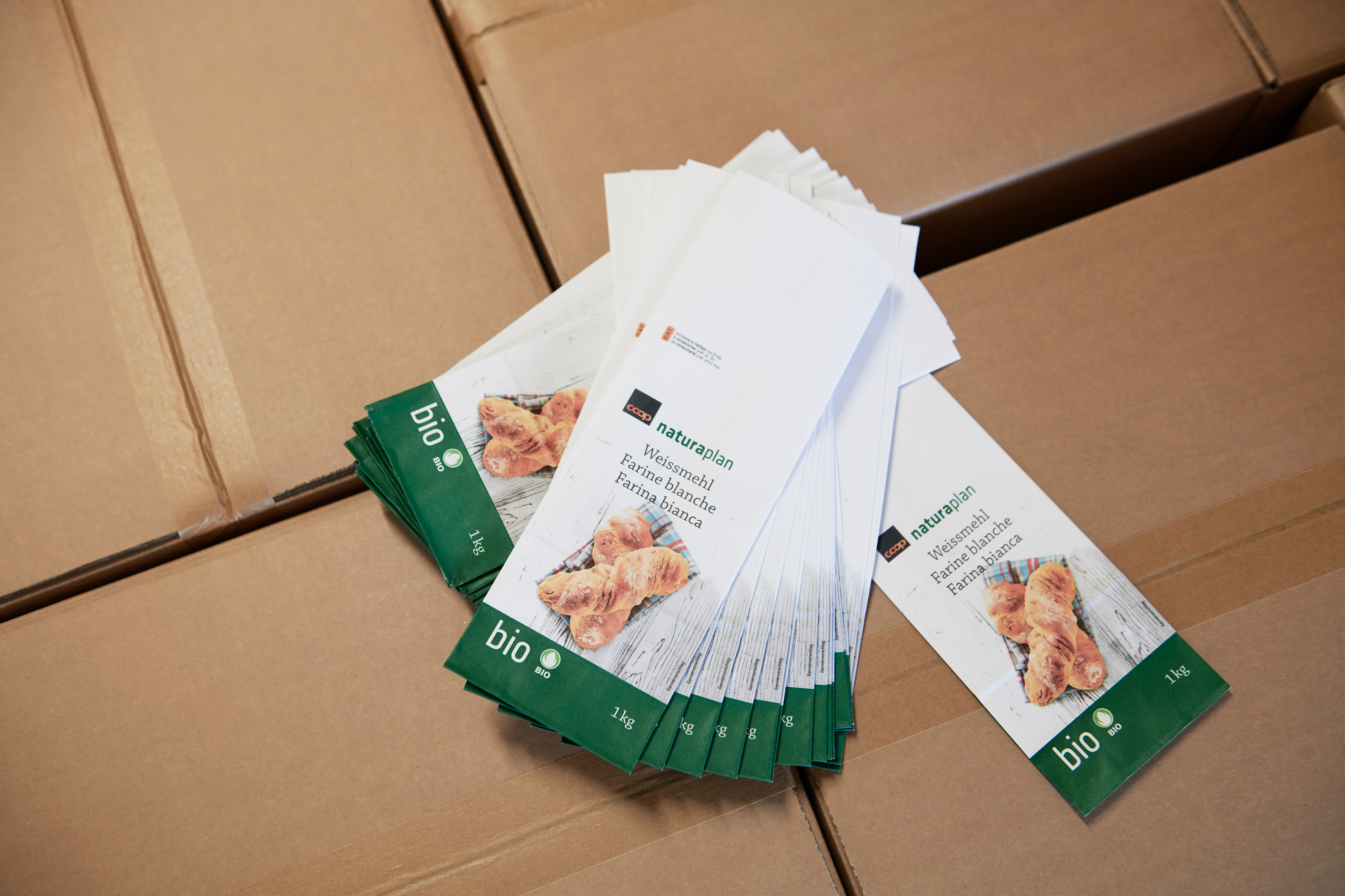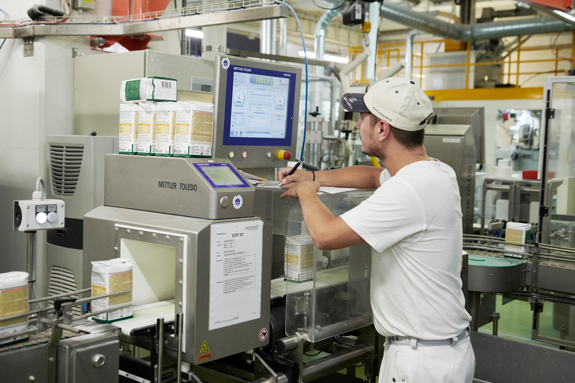 Pius Bürgi nutzt die Zeit, um der Besucherin einen Einblick zu geben, derweil zwei Mechaniker die Ursache des Stillstands beheben, damit die Linien rasch wieder regulär laufen. Die Linie 2 fertigt neben 1 kg-Packungen auch 500 g-Packungen mit einer Stundenleistung von maximal vier bzw. zwei Tonnen. «Bei jedem Produktwechsel sind Reinigungen, Maschinenumstellungen wie auch Gebinde- und Etikettenwechsel nötig, das braucht Zeit», erklärt Pius Bürgi. «Die Durchschnittsleistung variiert also, wenn wir zwei Tage lang ein gleiches Palettenprodukt mit Weiss- oder Ruchmehl produzieren oder einige wenige Tonnen Pizzateigmehl und Fertigmischungen in 500 g-Packungen.»